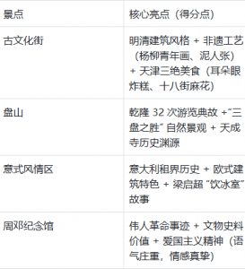 - 数据准确不出错:牢记天津景点核心参数,如 “古文化街全长 580 米”“盘山‘三盘之胜’(上盘松、中盘石、下盘水)”“天津之眼 48 个座舱”;