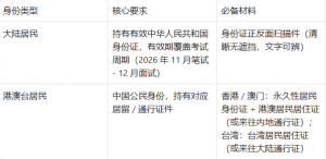 - 证件要求:香港 / 澳门考生需提供永久性居民身份证 + 港澳居民居住证(或来往内地通行证);台湾考生需提供台湾居民居住证(或来往大陆通行证);
